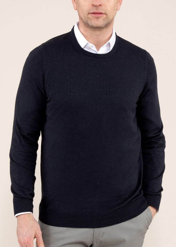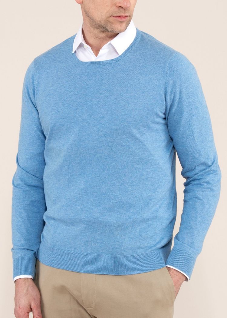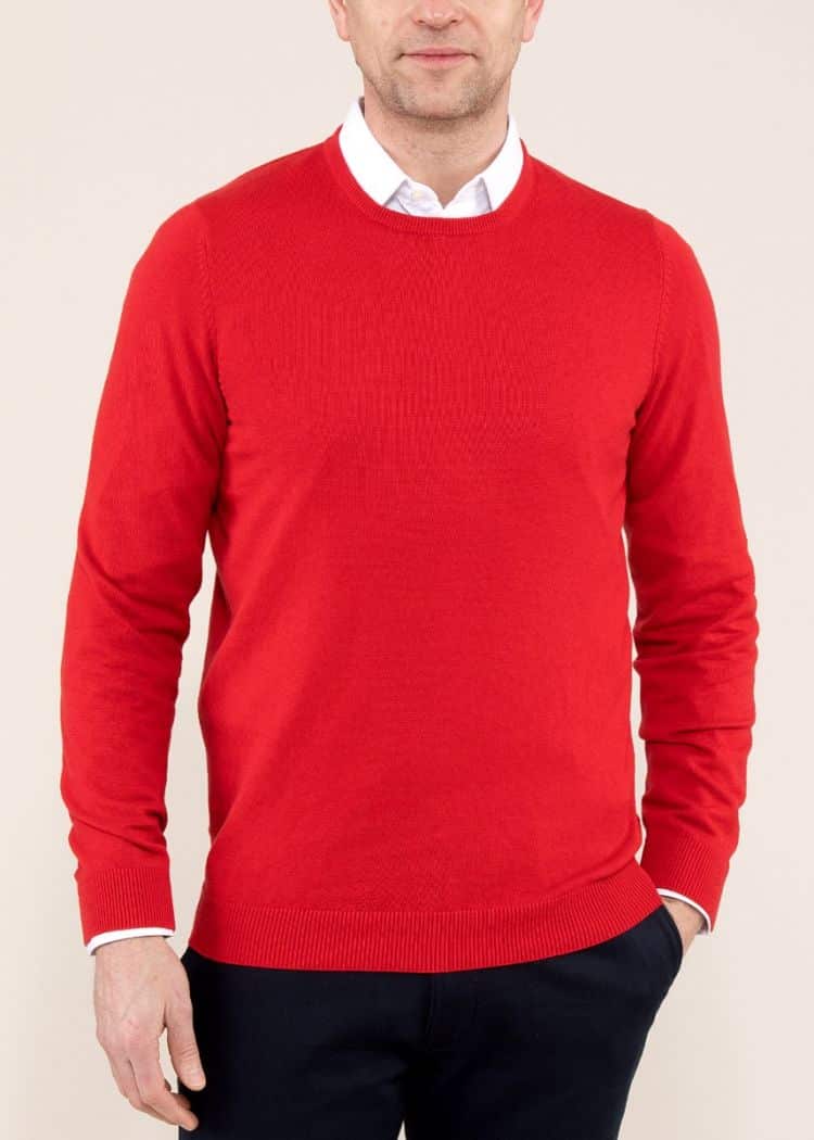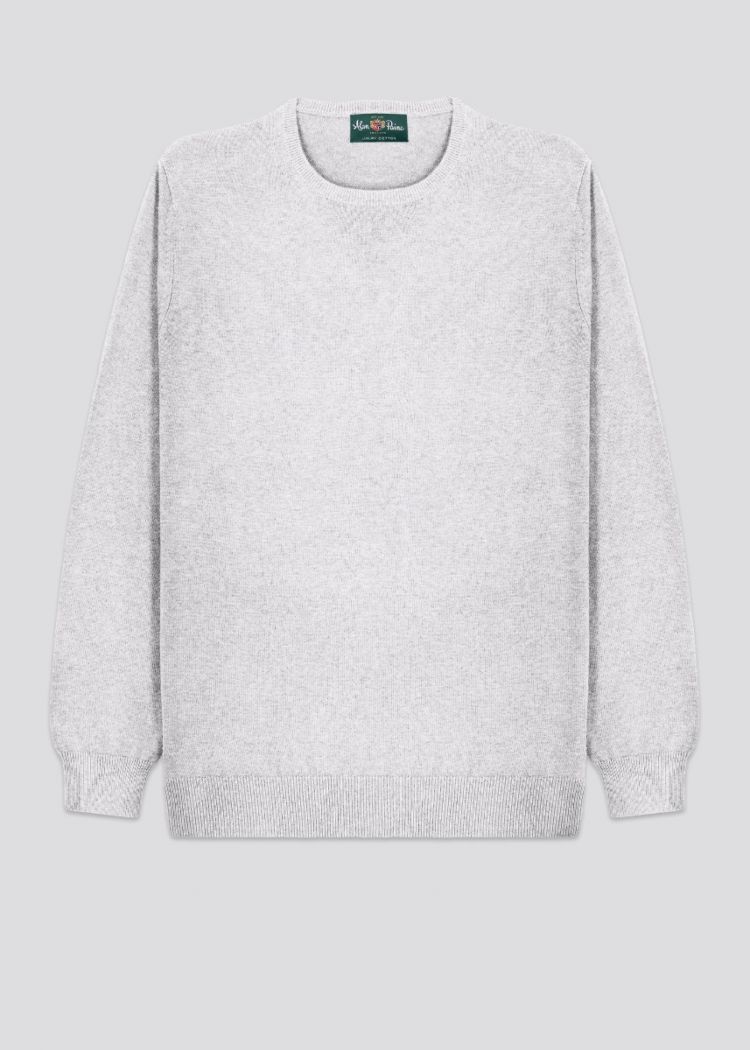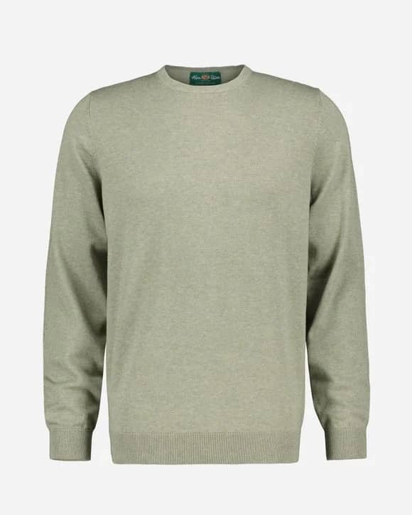 Lækker bomuld/cashmere strik fra engelske Alan Paine. Det specielle ved strik fra Alan Paine er at de bliver færdiggjort med hånden i England. Denne model er med rib på ærmer og talje. Strikken passer både til en pæn hvid skjorte eller med en hvid t-shirt og shorts. Et must have til den kræsne mand. Modellen er normal i størrelsen og blandingen er 92% bomuld og 8% cashmere.