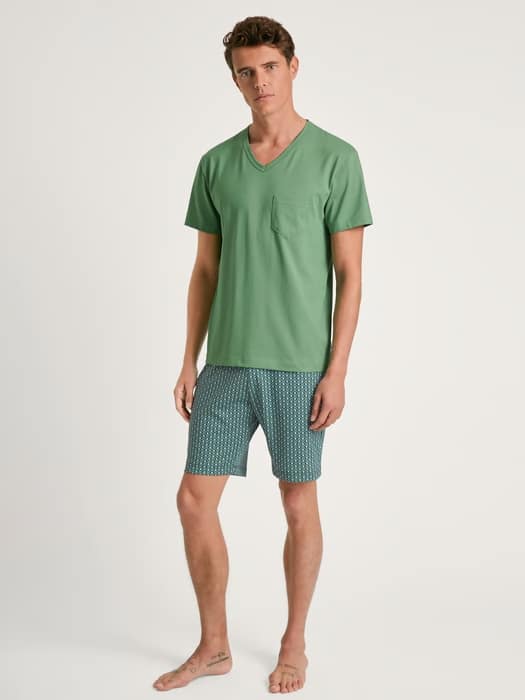 Smart kort pyjamas fra Calida med en grøn overdel med v-hals og et par smarte grønternet shorts i Calidas sædvanlige lækre bomulds kvalitet. Modellen er normal i størrelsen.