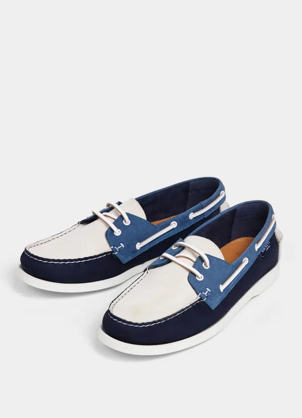 Smart sommernyhed fra engelske Hackett er disse sejlersko med de som Hackett kalder et mix boat da skoen er lavet i 3 farver, blå, navy og hvid. Skoen er lidt lille i størrelsen derfor anbefaler vi at man køber et nummer større end man bruger normalt. Et frisk pust både til et par jeans eller til shorts.