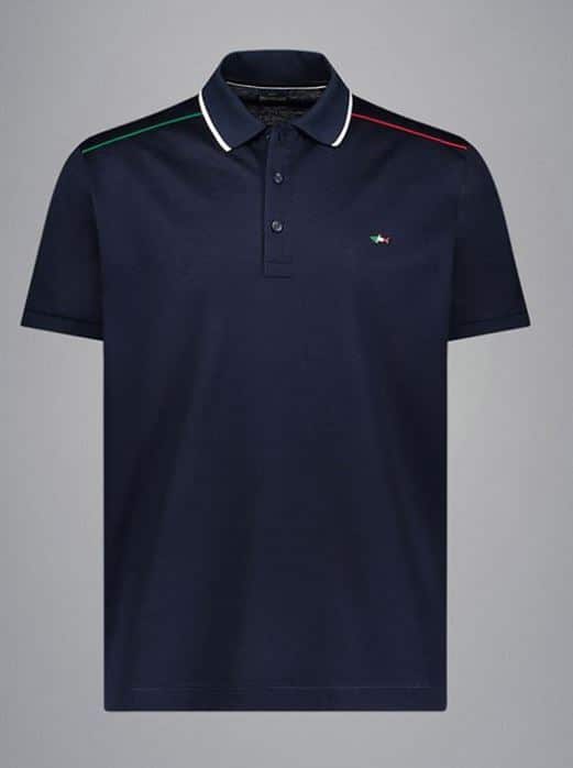 Lækker let polo fra italienske Paul & Shark med smarte kontraster på skuldrene med henholdsvis rød, hvid og grøn som det italienske flag.  Det samme gør sig gældende på hajen som er tri colore. Kvaliteten er ren bomuld og modellen er normal i størrelsen.