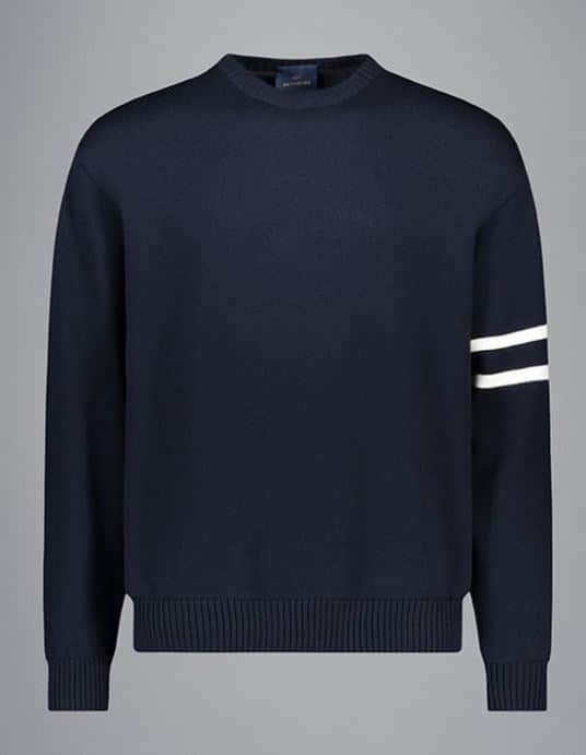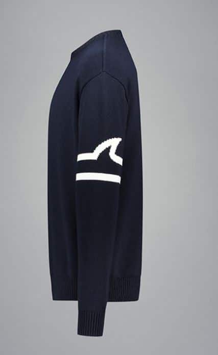 Smart nyhed fra italienske Paul and Shark er denne flotte marineblå pullover med rundhals. Her har man lavet en hvid stribe på venstre ærme der forestiller en haj finne. et super touch af italiensk elegance. Pulloveren er i ren uld og er normal i størrelsen.