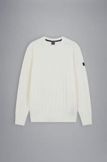 Flot kraftig pullover fra Paul & Shark, Pulloveren er i ren ny uld. den har desuden Paul & Sharks kendte cool touch funktion så den altid føles behagelig at have på. Pulloveren er hvid.