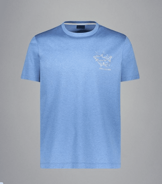 Lækker sommernyhed fra italienske Paul & Shark er denne flotte lyseblå t-shirt lavet i en merceriseret jersey, t-shirten har et par svømmende hajer på venstre side af brystet.